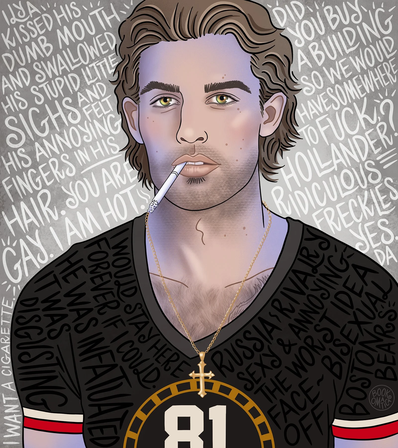 Type Map for Heated Rivalry by Rachel Reid – A portrait of Shane looking besotted with Ilya, and a bit flustered in his feeeelings.